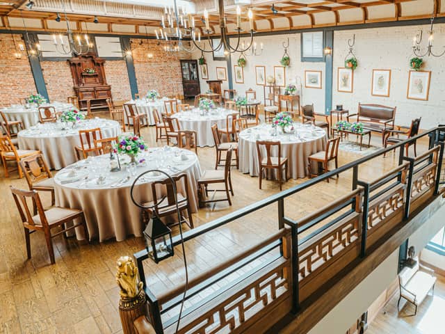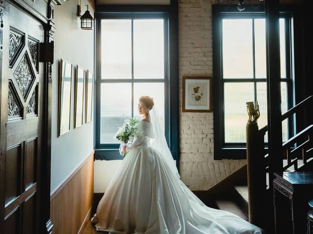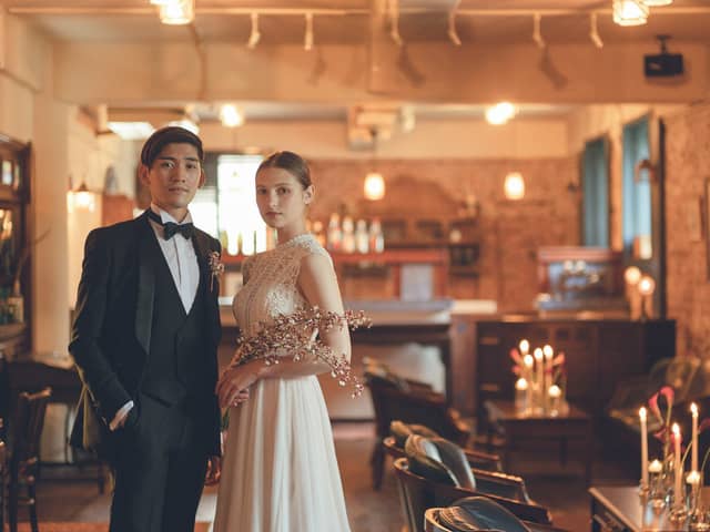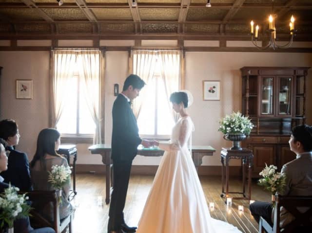 折り上げ格天井が特徴的な挙式会場。元々古美術商を営んでいたこともあり他とは違う重厚感溢れるチャペルをご紹介。